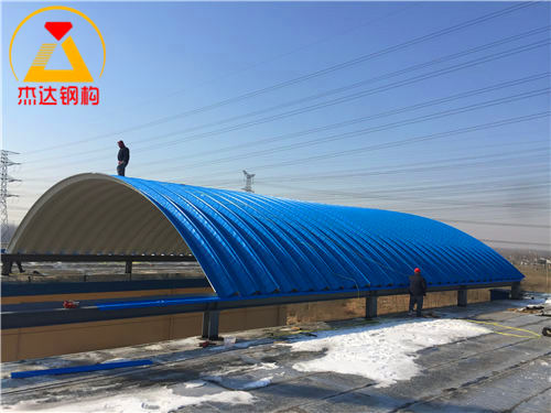 江蘇倉間罩棚通常采用在原糧庫上架設水泥站柱,再安裝H型鋼梁,最后焊接托板形成拱形屋頂的結構。這種設計適用于沒有預埋件的舊糧庫,通過后期加固實現倉間罩棚的功能,確保糧食儲備環境的改善。