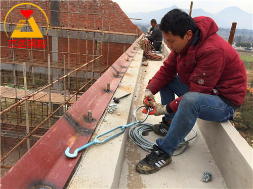 拱形屋頂?shù)拇u墻上口以及全鋼結(jié)構(gòu)的鋼柱頂部通常會(huì)安裝拉鋼絲繩,以增強(qiáng)結(jié)構(gòu)的受力能力。鋼絲繩一般選用M12或M14規(guī)格,既能滿足承載需求,也保證了耐久性。