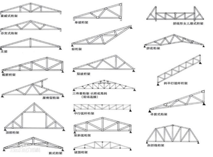 從力學方面分析,桁架外形與簡支梁的彎矩圖相似時,上下弦桿的軸力分布均勻,腹桿軸力小,用料很??;從材料與制造方面分析,木桁架做成三角形,鋼桁架采用梯形或平行弦形,鋼筋混凝土與預應力混凝土桁架為多邊形或梯形為宜。