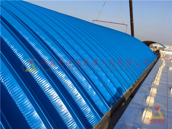 拱形屋頂是采用國(guó)際先進(jìn)的MIS240(914-610)配套設(shè)備,以0.6-1.5㎜厚專用彩涂成卷鋼板為原料,經(jīng)過(guò)現(xiàn)場(chǎng)壓板、鎖邊、吊裝后成型的大跨度屋面結(jié)構(gòu)。它設(shè)計(jì)施工周期短、投資少、施工快,廣泛適用于國(guó)家糧庫(kù)、工業(yè)廠房、集散市場(chǎng)、倉(cāng)儲(chǔ)庫(kù)房、車庫(kù)機(jī)庫(kù)等。