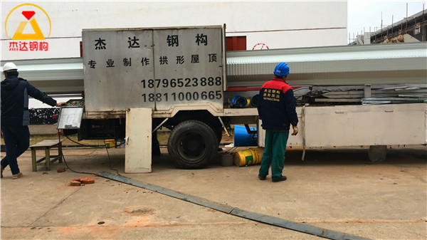 屋面板的制作及安裝是項(xiàng)目的關(guān)鍵步驟。彩涂卷板通過專業(yè)設(shè)備壓制成型,保證尺寸精確與表面平整。組裝環(huán)節(jié)嚴(yán)格按照設(shè)計(jì)圖紙進(jìn)行,確保拱形屋頂整體形態(tài)符合施工要求。吊裝過程中,施工人員配合有序,采用安全的吊裝方案,保障吊裝作業(yè)的高效與安全。