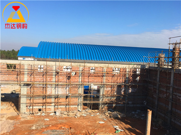 本項(xiàng)目的拱形屋頂跨度達(dá)到24米,總長度約為114米,分為兩棟建筑,一棟長度約為52米,另一棟約62米。屋頂采用了1.2毫米厚的海藍(lán)色彩涂卷板,這不僅增強(qiáng)了屋頂?shù)姆栏g性能,還提升了整體的美觀度。
