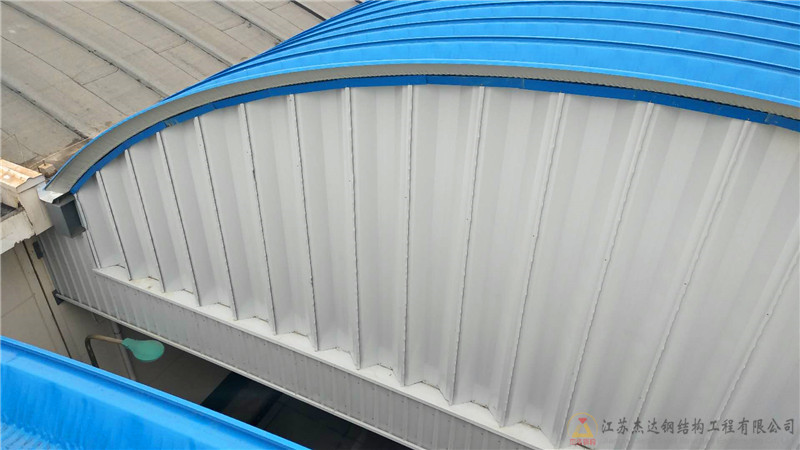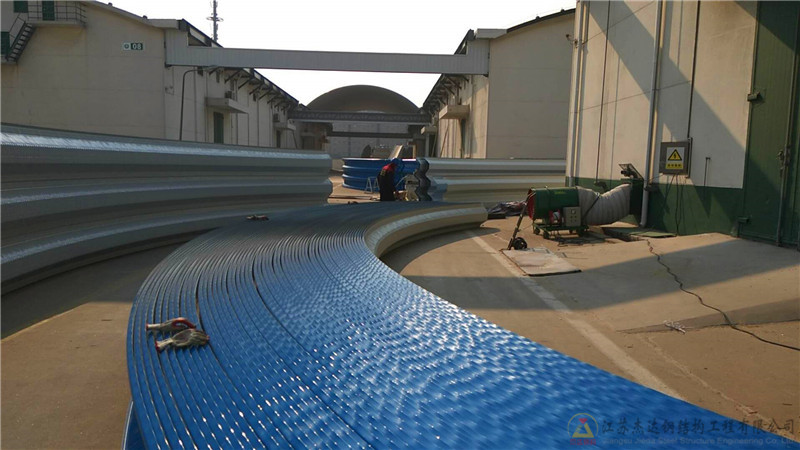施工方面,江蘇杰達鋼結(jié)構(gòu)工程有限公司施工團隊嚴格依照設(shè)計方案展開作業(yè)。現(xiàn)場照片顯示,彩涂卷板瓦片已完成生產(chǎn),屋頂組裝工作正有序進行,部分拱形屋頂結(jié)構(gòu)清晰可見,施工進展順利。