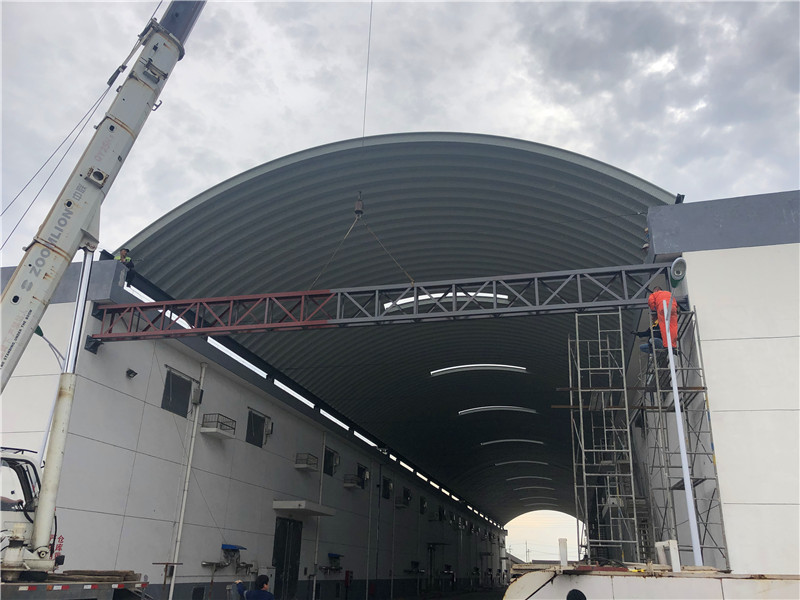 在拱形屋頂安裝完畢后,項目進入山墻桁架吊裝階段。桁架將作為山墻固定的主要支撐框架,后續完成封裝后將進一步提升整體密閉性。