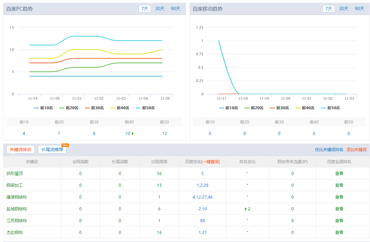 從安全上的數據來看,我們的鹽城鋼結構這個關鍵詞同期上升了兩名,杰達鋼構這個關鍵詞上升了一名。